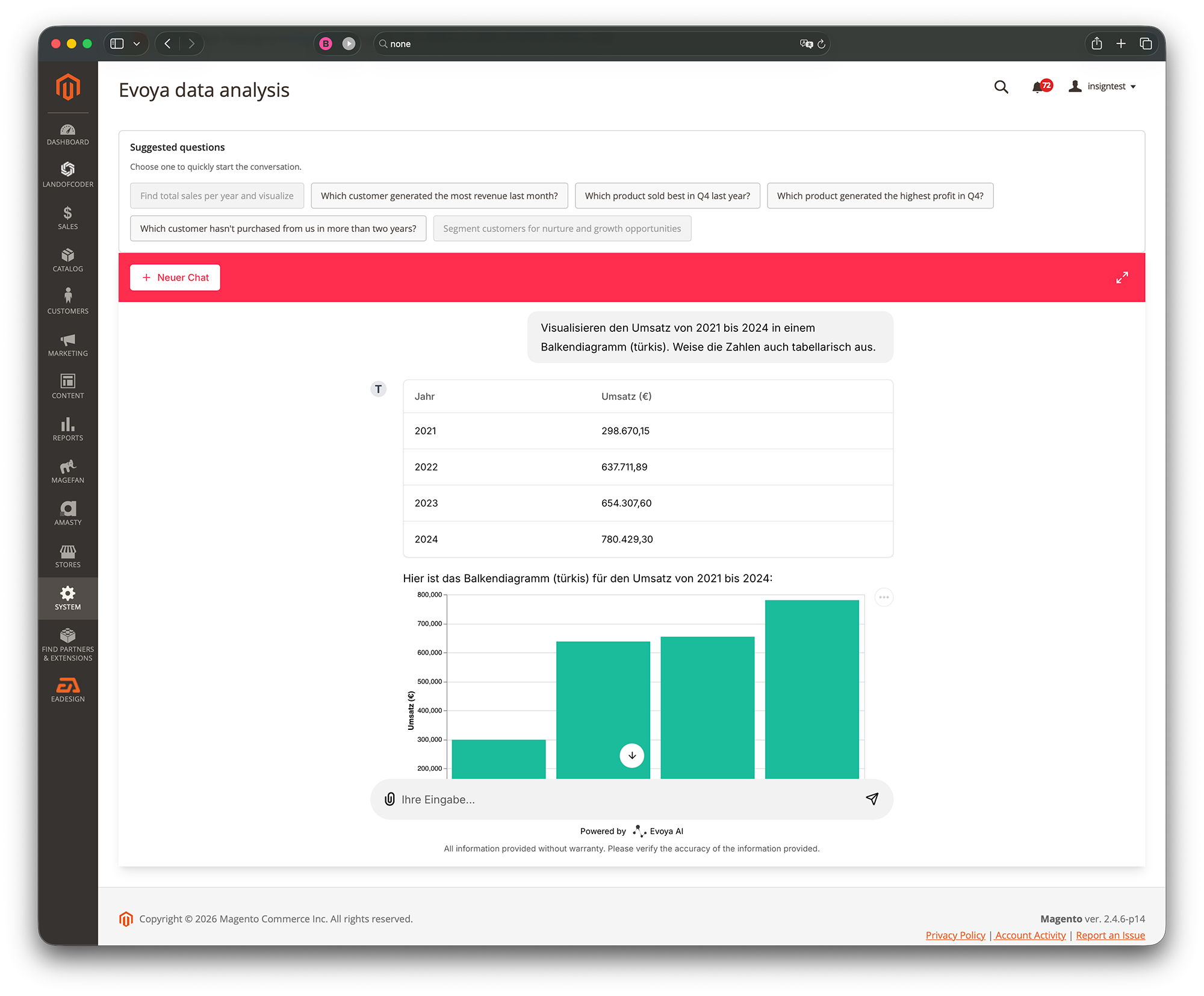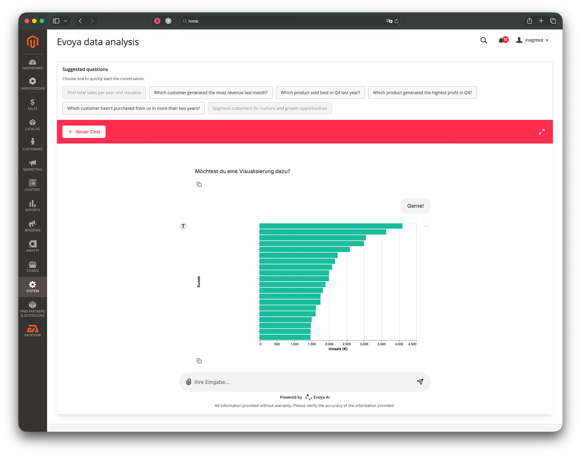 Klicken Sie auf den Chat und fragen Sie Magento, was auch immer Sie wissen müssen. Es geht nur einen kurzen Moment und schon haben Sie die Antwort, auf Wunsch mit entsprechender Grafik oder dem zugehörigen SQL-Statement, wenn Sie ganz genau wissen möchten, wie die Magento-KI auf Ihre Antwort kam.