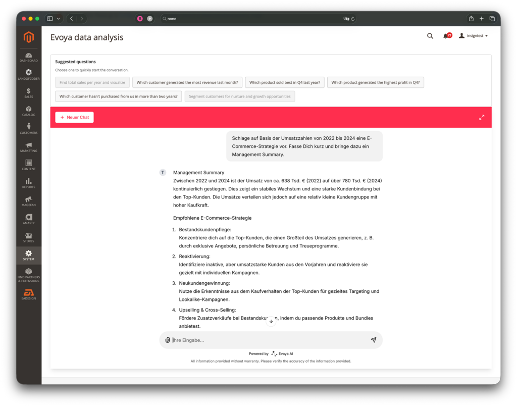 Genau! Das haben wir in Zusammenarbeit mit unserem KI-Startup Evoya AI gebaut: Ein im Magento-Backend integrierter Chat.