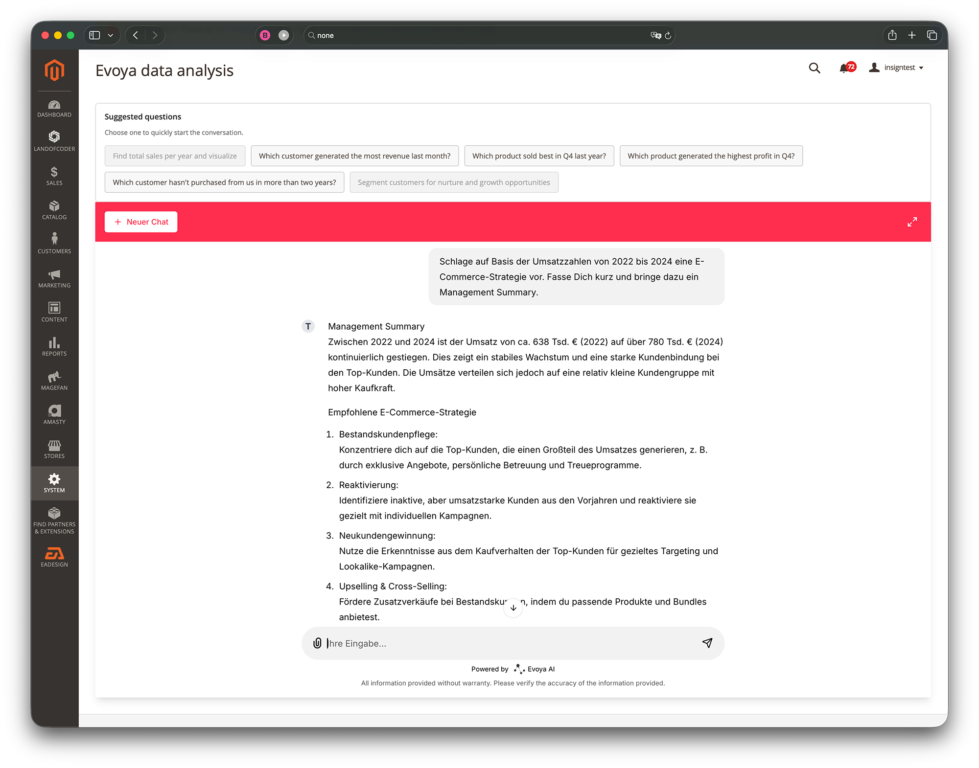 Das Beste dabei: Wenn eine bestimmte Auswertung nicht möglich ist, weil z.B. Daten fehlen, dann macht die in Magento integrierte künstliche Intelligenz freundlich einen Vorschlag, wie man dennoch ans Ziel kommen könnte.