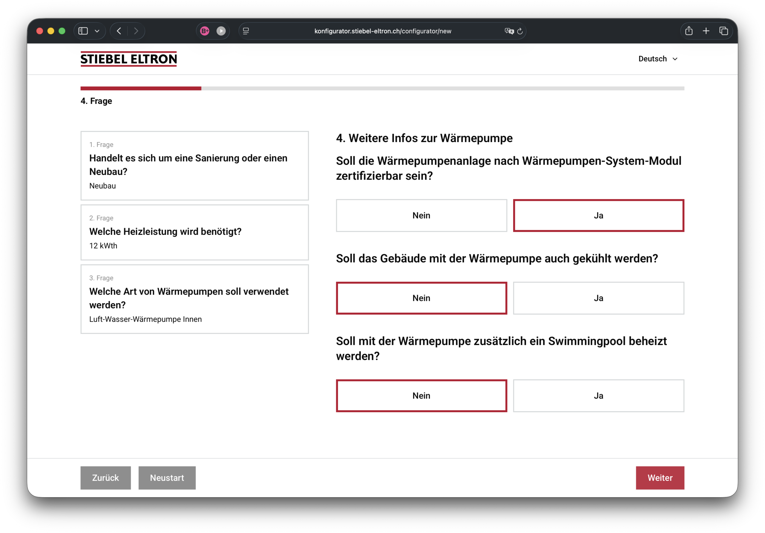 Der Frontend-Prozess ist vollständig geführt: Anwender werden Schritt für Schritt durch die Konfiguration geleitet. Abhängig von den gewählten Antworten ermittelt das System automatisiert die passenden Komponenten.