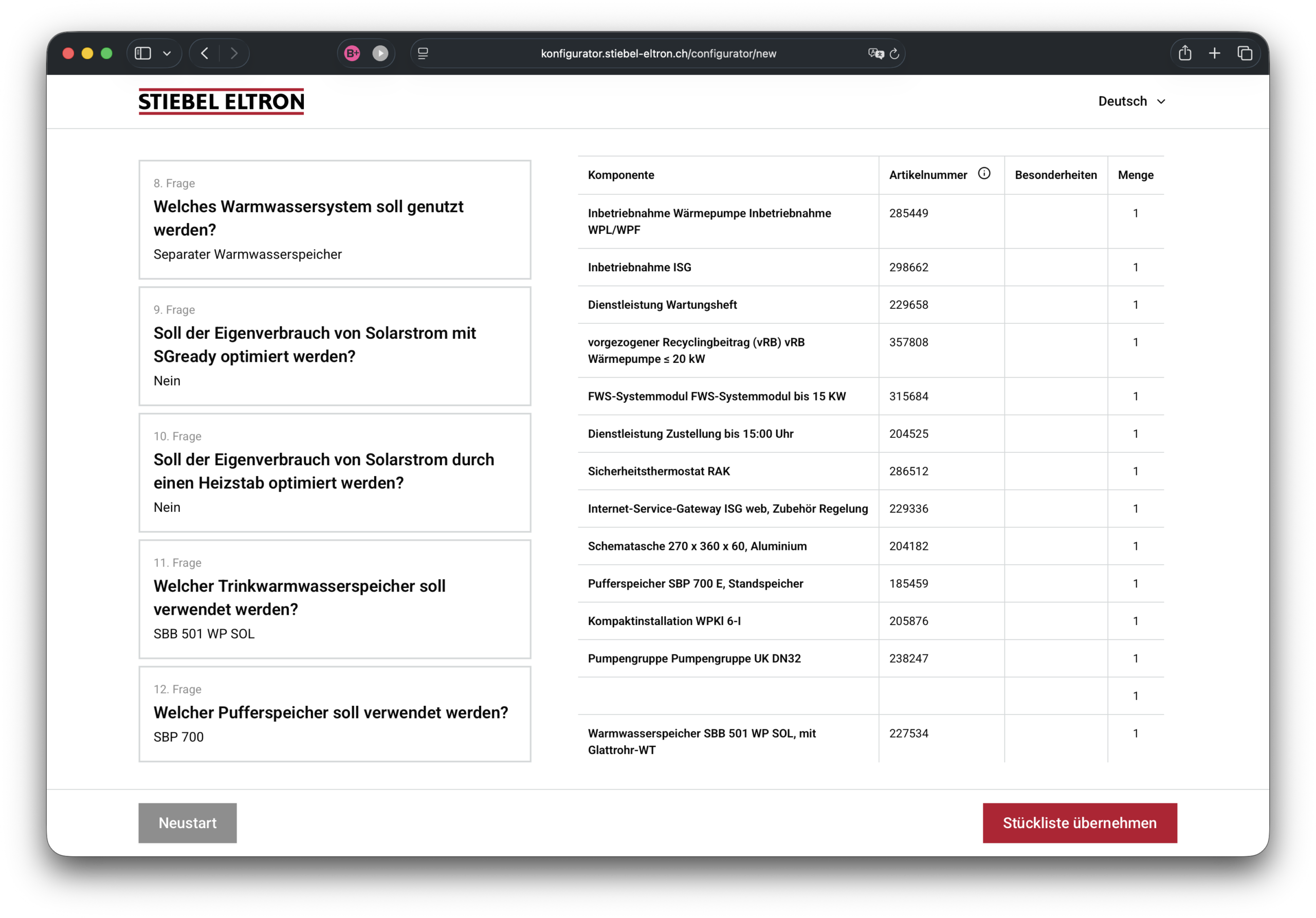 Am Ende erhalten die Nutzer eine automatisch generierte Komponentenliste, die sämtliche relevanten Produkte und Bausteine für die konfigurierte Wärmepumpenlösung umfasst.
